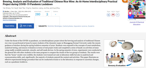 本网讯 近日,我校化学化工学院张龑、杨一思老师在化学教育类国际重要期刊《Journal of Chemical Education》上发表了题为《Brewing, Analysis and evalsuation of Traditional Chinese Rice Wine: An At-Home Interdisciplinary Practical Project during COVID-19 Pandemic Lockdown》的教学研究论文(J. Chem. Educ. 2022, 99, 8, 2904–2912. DOI: https://doi.org/10.1021/acs.jchemed.2c00073),国产精品永久久久久久久久久|91精品无码国产在线观看一区|久久人爽爽人爽爽ąV无码自慰|最新无码国模国产在线|2020最新无码国产在线观看化学化工学院为唯一完成单位。这也是继2021年两位教师在《Journal of Chemical Education》发表我校首篇化学专业教学研究SCI期刊论文后的第二篇论文。