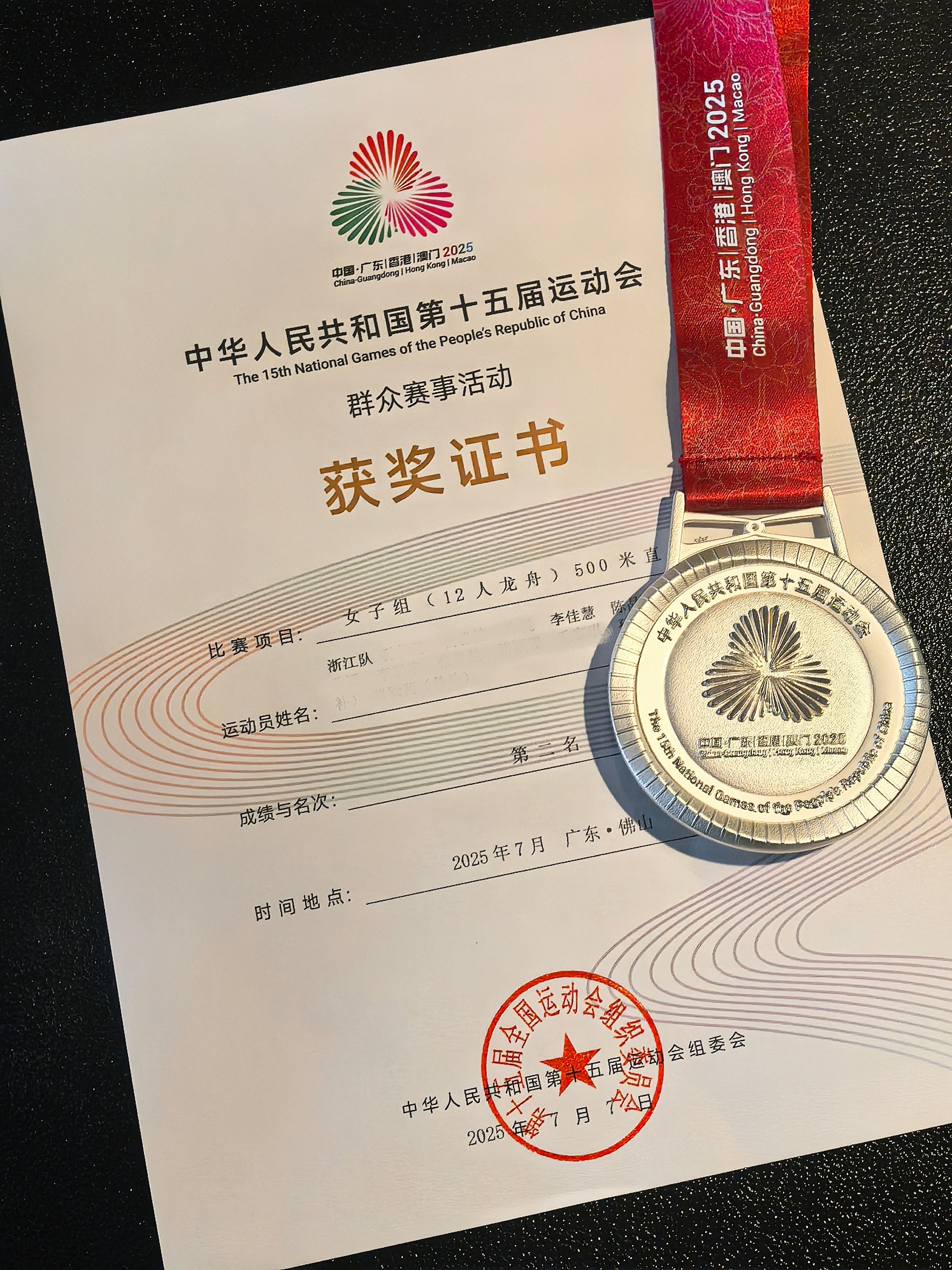 本网讯 7月5日至7日,第十五届全国运动会群众比赛龙舟项目决赛在佛山市南海区丹灶镇仙湖举行,23支龙舟队伍展开激烈角逐。我校体育学院新进教师李佳慧作为浙江省女子组主力队员,与队友们在女子12人龙舟500米直道赛中夺得第二名。