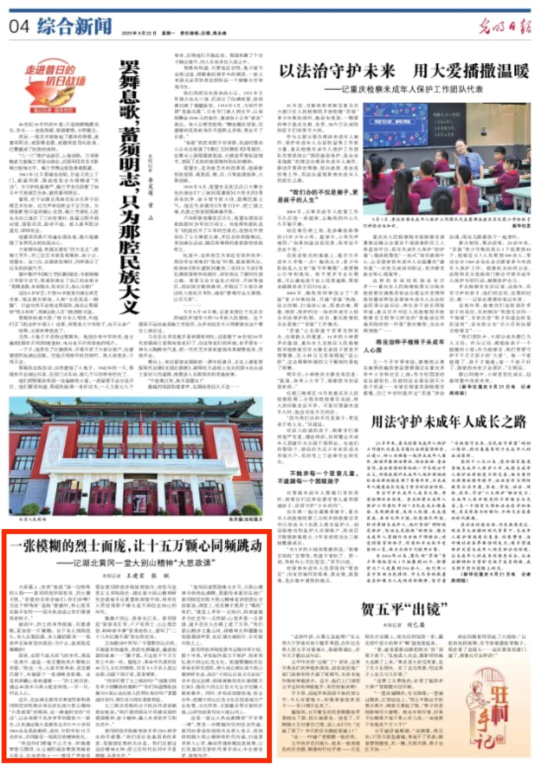 9月22日,《光明日报》04版刊发报道《一张模糊的烈士面庞,让十五万颗心同频跳动——记湖北黄冈一堂大别山精神“大思政课”》。一起来看——